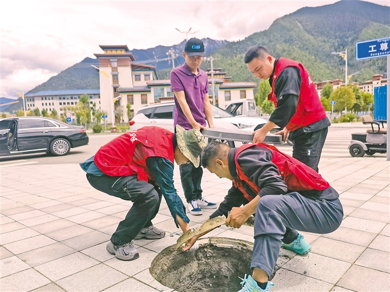 图②:街道社区志愿者沿街清理窖井盖,疏通下水道。
