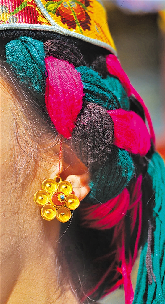 女士们的服饰则更加绚丽多彩。她们大多穿着黑色氆氇藏袍,系着彩虹条纹的围裙“邦典”,既显得端庄得体,又不失女性柔美。她们佩戴的耳环、项链、手镯、戒指等饰物虽然简单,但却淡雅朴素,与高原的自然风光相得益彰。特别值得一提的是,墨竹工卡县的女性喜爱佩戴花朵形耳饰,与她们所戴的帽子“朗霞”形成了完美的搭配。