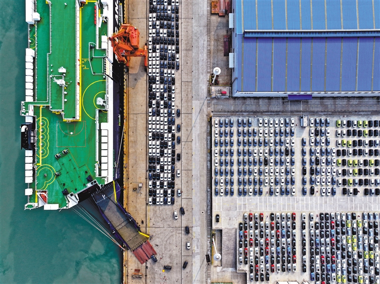 图为2月21日,在江苏省连云港港东方港务分公司码头,滚装轮停在泊位上装载出口轿车(无人机照片)。
