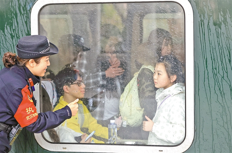 图为2月22日,民警在湖北武昌站的站台上向列车内的小朋友微笑示意。新华社发(赵军 摄)