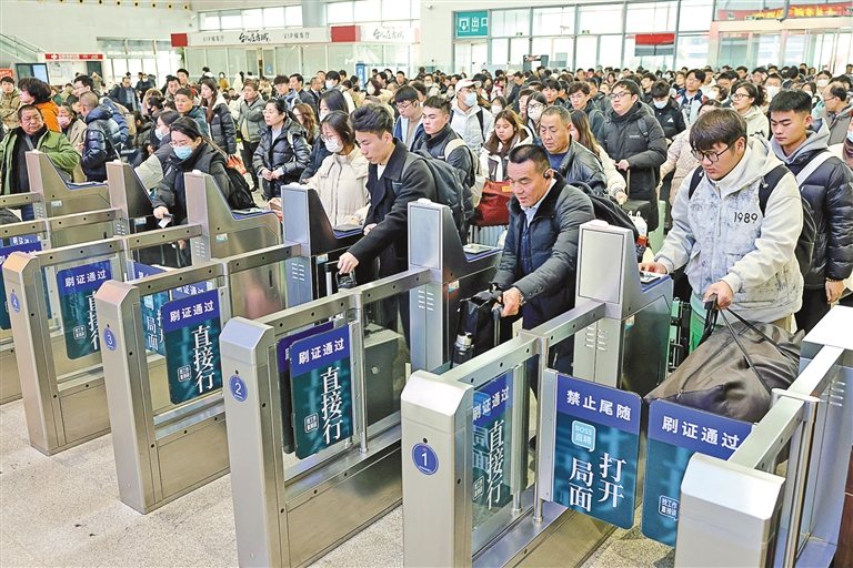 图为2月22日,旅客在山东枣庄站通过闸机检票进站。 新华社发(孙中喆 摄)