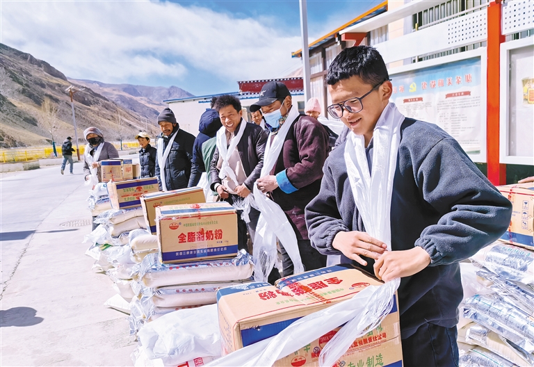 在藏历新年来临之际,浪卡子县白地乡杂塘村村集体经济合作社举行分红大会,为全村发放价值约6万元的生活物资,让村民共享集体经济发展成果,开开心心喜迎藏历新年。 图为分红现场。 本报记者 武沛涛 摄