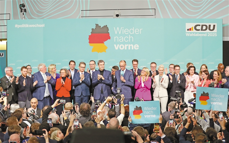 图为2月23日,在德国柏林的基督教民主联盟总部,联盟党总理候选人默茨在出口民调显示领先后接受祝贺。 新华社记者 杜哲宇 摄