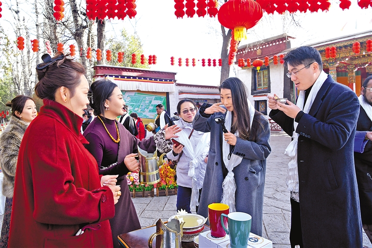 (下转第二版)(紧接第一版) 来自西安的曹女士刚体验完青稞酒又被工作人员递上来的精美文创礼品吸引了眼球。她感叹:“来这过藏历新年,既能感受传统藏历新年的民俗活动,又能把藏文化带回家,这样的新年太有意义了!”