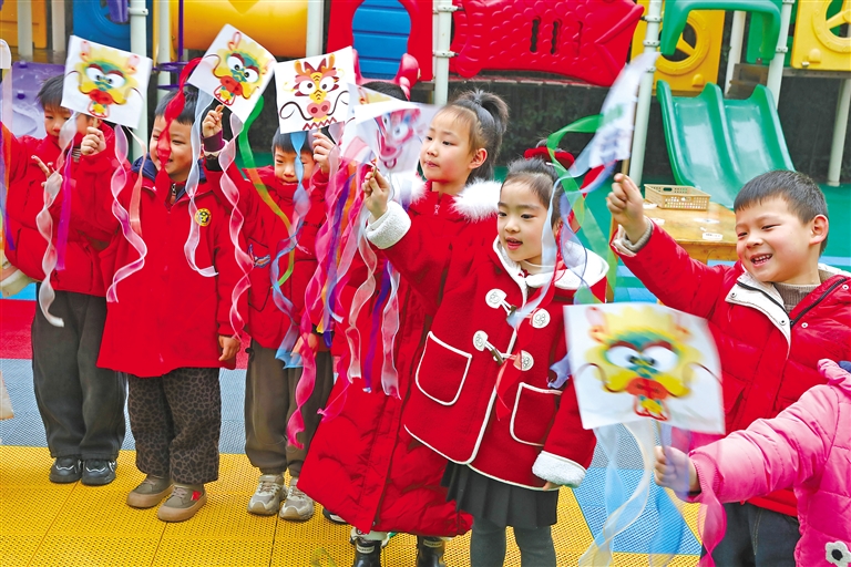 图③:2月27日,江苏省宜兴市均陶幼儿园的孩子们展示“贴龙须”小手工作品。