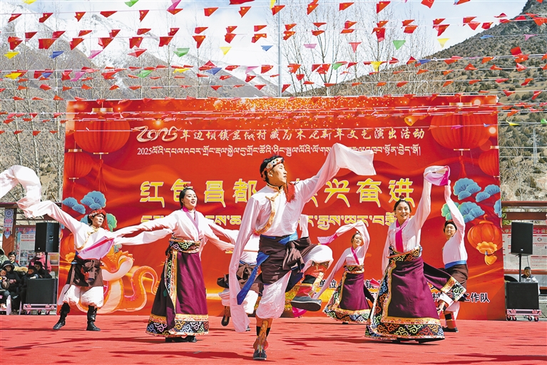 2月28日,全国“村晚”示范点昌都市边坝县显俄村热闹非凡,一场以“红色昌都·振兴奋进”为主题的“村晚”文艺演出在此举行,吸引了1000余名群众观看。活动现场,各族群众身着盛装,共同欣赏这场文化盛宴。演出人员用优美的舞姿、欢快的节奏,为观众带来一场活力与激情四溢的视听享受。