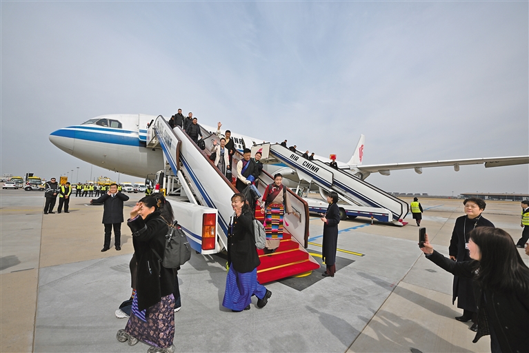 图为我区参加全国两会的代表委员乘机抵达北京。 本报记者 旦增西旦 摄