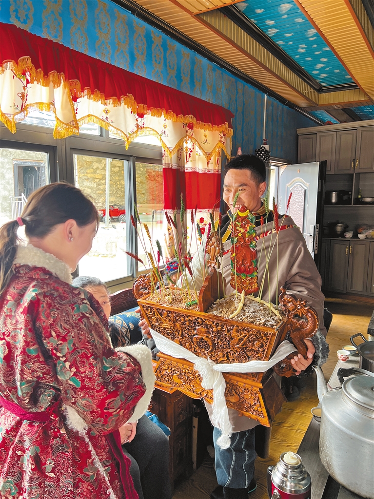 图为崔久乡小朋友们带着“切玛”来到村民家中。 本报记者 央金 摄