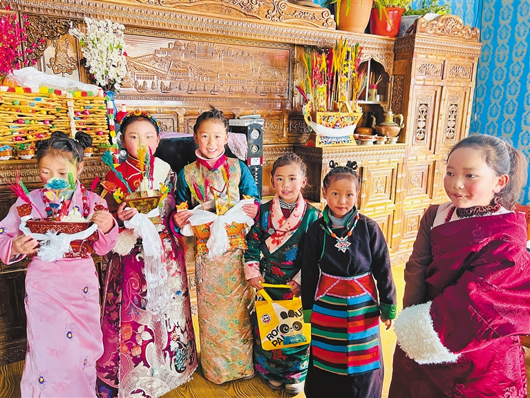 藏历新年期间,在山南市加查县崔久乡,身着藏装的小朋友们带着家人准备的“切玛”,前往村民家中请大家吃寓意五谷丰登的“切玛”。