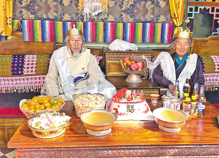 爷爷拉增(左)在家过八十大寿。本报记者 次旦玉珍 摄
