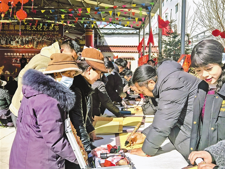 图为活动中,拉萨书法家为社区居民书写新年祝福语。 本报记者 拉巴桑姆 摄
