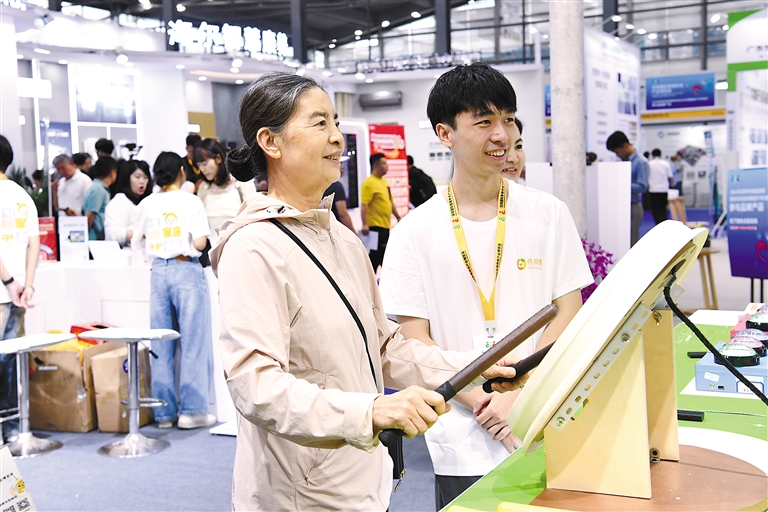 上图:2024年10月27日,老人在2024深圳国际智慧养老产业博览会上体验乐龄鼓。