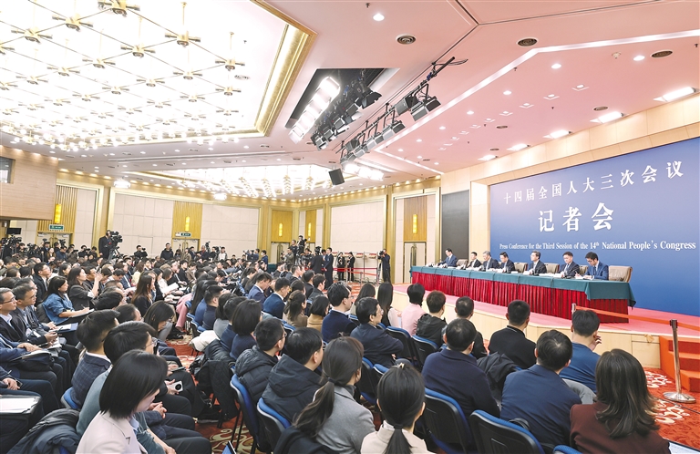 3月6日,十四届全国人大三次会议在北京梅地亚中心新闻发布厅举行记者会。国家发展和改革委员会主任郑栅洁、财政部部长蓝佛安、商务部部长王文涛、中国人民银行行长潘功胜、中国证券监督管理委员会主席吴清就发展改革、财政预算、商务、金融证券等相关问题回答中外记者提问。