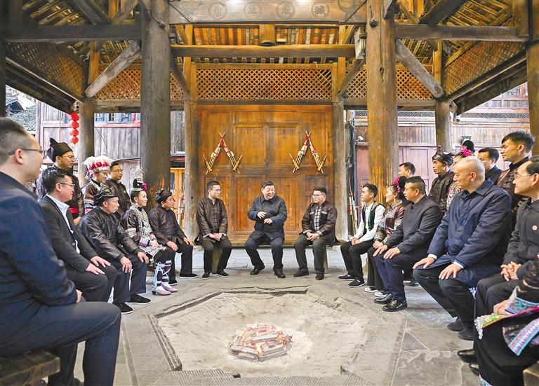 3月17日至18日,中共中央总书记、国家主席、中央军委主席习近平在贵州考察。这是17日下午,习近平在黔东南州黎平县肇兴侗寨考察时,同村民们亲切交流。新华社记者 翟健岚 摄
