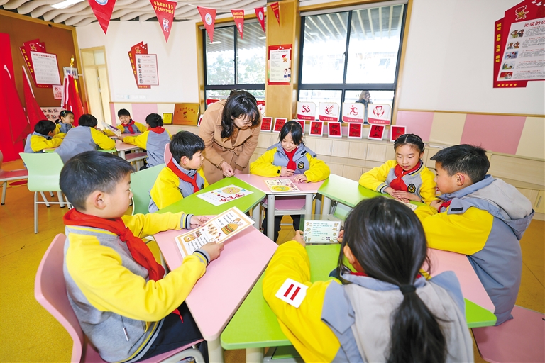 近期,浙江省杭州市各级医院逐步开设体重管理门诊,同时学校加强健康均衡膳食教育,倡导并推广文明健康的生活方式,提升市民体重管理意识与技能。 图为3月17日,杭州市长寿桥岳帅小学老师为学生讲解健康均衡膳食知识。新华社记者 江汉 摄