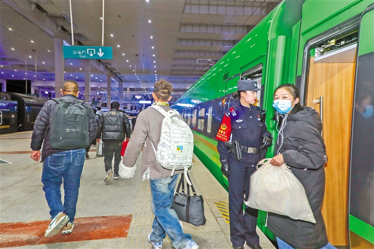 图③:“格桑梅朵”女子乘务组乘警引导旅客平安下车。