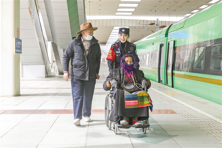 图②:“格桑梅朵”女子乘务组乘警护送老年旅客安全乘车。