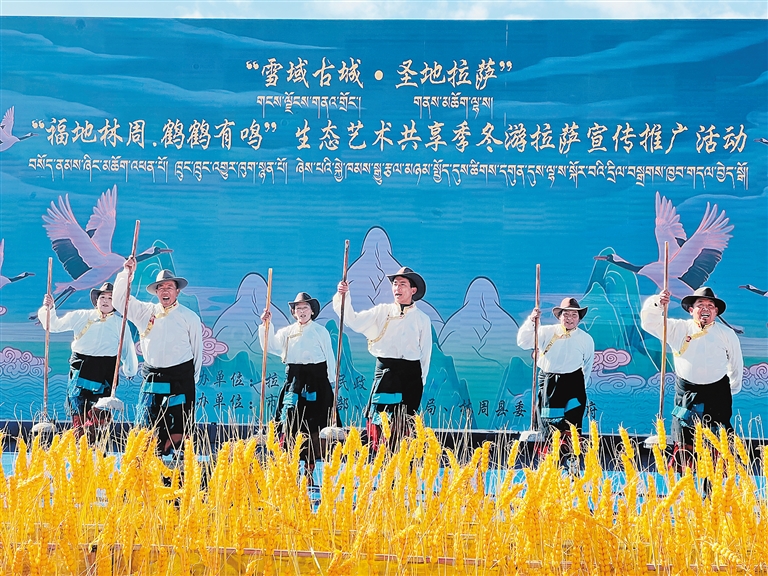 当温暖的阳光轻柔地洒在拉萨河谷,黑颈鹤清脆的鸣叫声唤醒了林周湿地宁静的清晨。“福地林周·鹤鹤有鸣”生态艺术共享季之“冬游拉萨”宣传推广活动,以歌舞表演、生态主旨演讲、黑颈鹤摄影作品展、鹤文化专家座谈等,融合了生态、艺术与文化的盛宴,让人在雪山、湖泊与鹤影交织的诗意中,感受“冬游拉萨”的独特魅力。
