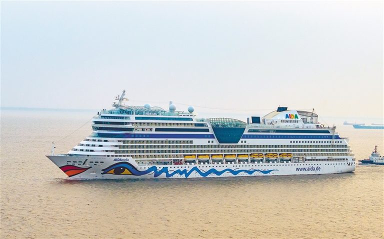 3月16日,德国AIDA邮轮公司旗下“阿依达·星辰号”和皇家加勒比的“海洋光谱号”靠泊上海吴淞口国际邮轮港,两艘大型国际邮轮共带来近4800名外籍游客入境。这是上海吴淞口国际邮轮港自2011年开港以来创造的单日入境外籍游客数的最高纪录。图为“阿依达·星辰号”邮轮航行在上海吴淞口国际邮轮港水域(无人机照片)。新华社发(朱嘉奕 摄)