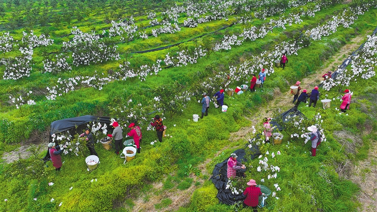 春分前后,各地农民抢抓农时开展春耕、春种、春管等农业生产工作,争取好收成。图为3月18日,在四川省阆中市金垭镇,工人在果园采摘柑橘(无人机照片)。 新华社发(王玉贵 摄)