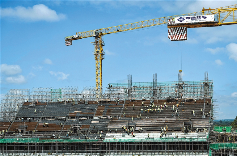 图为3月18日,在肯尼亚首都内罗毕,工人们在塔兰塔体育城项目施工现场作业。新华社记者 韩旭 摄