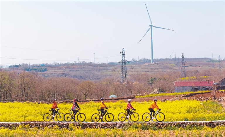 图②:3月20日,骑行者在安徽省滁州市来安县张山镇的油菜田中拍照打卡。新华社记者 杜宇 摄