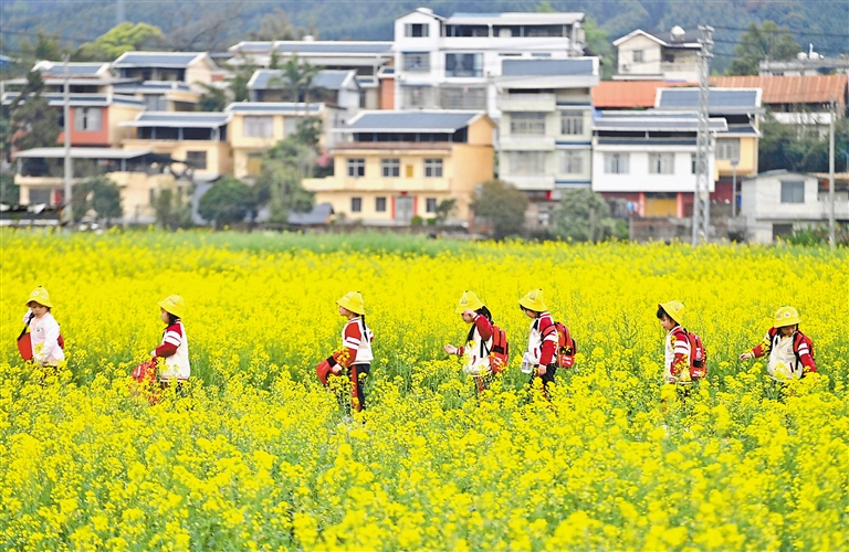 图①:3月21日,在广西柳州市融水苗族自治县融水镇新国村,小朋友在老师的带领下到油菜花地踏青游玩。