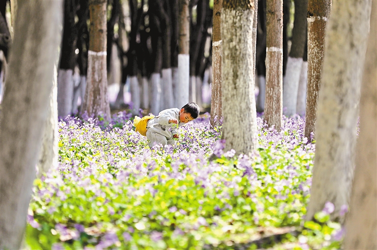 图③:3月21日,小朋友在浙江省嘉兴市穆湖森林公园观赏二月兰。新华社发(金鹏 摄)