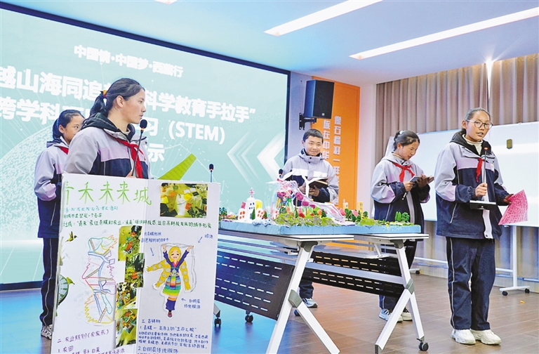 上图:来自日喀则和青岛的学生参加跨学科项目化学习(STEM)成果展。