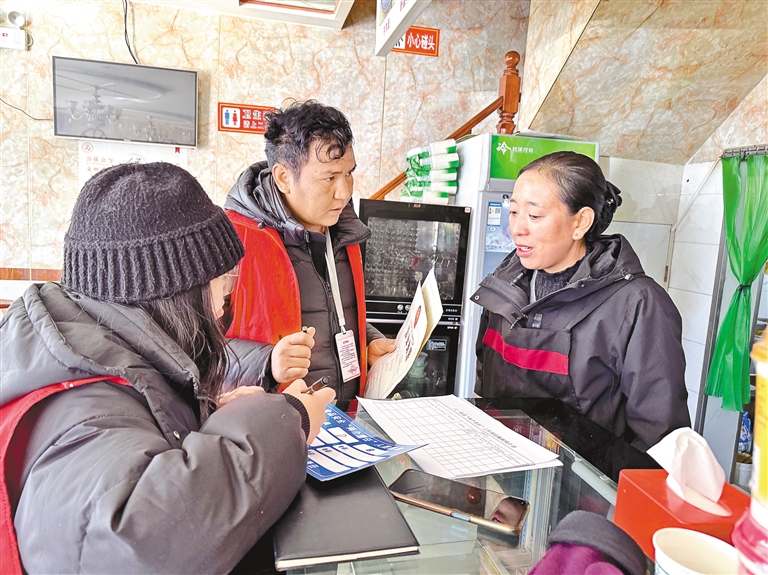 拉萨市城关区八一街道当热社区组织开展食品安全隐患排查工作。这是工作人员在仔细检查商户营业执照、食品卫生许可证和健康证等持证情况。 本报记者 王敏 摄