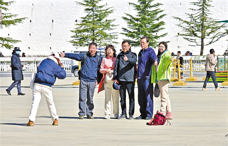 图为游客正在布达拉宫广场拍照留念。 本报记者 唐斌 摄
