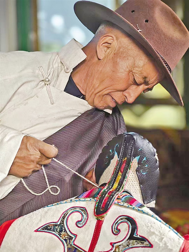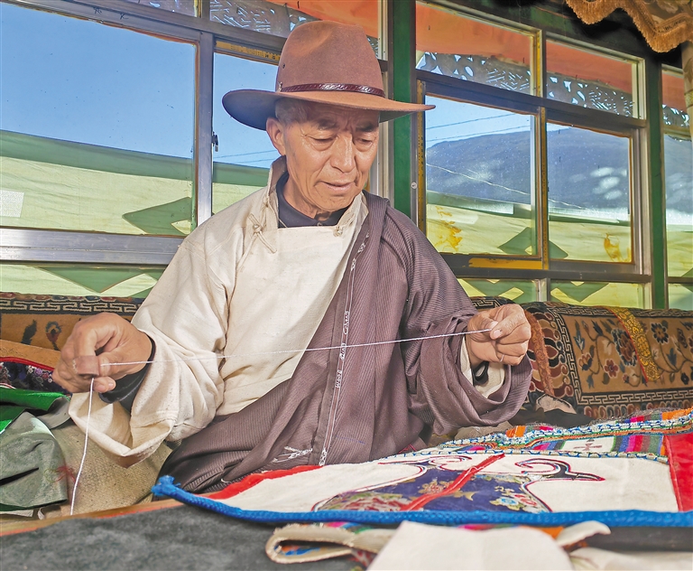 走进加措的工作室,仿佛踏入一座藏文化的宝库。精美的藏式传统服饰、色彩斑斓的面具、结实耐用的藏靴摆满各个角落。当加措专注制作藏式传统服饰时,手中针线上下翻飞,细腻针法令人惊叹。据他介绍,这门技艺在西藏民间裁缝技艺中独树一帜,全程纯手工制作,从裁剪到刺绣,每道工序都不容差错,这不仅要求匠人具备精湛的技艺,更需要十足的耐心。