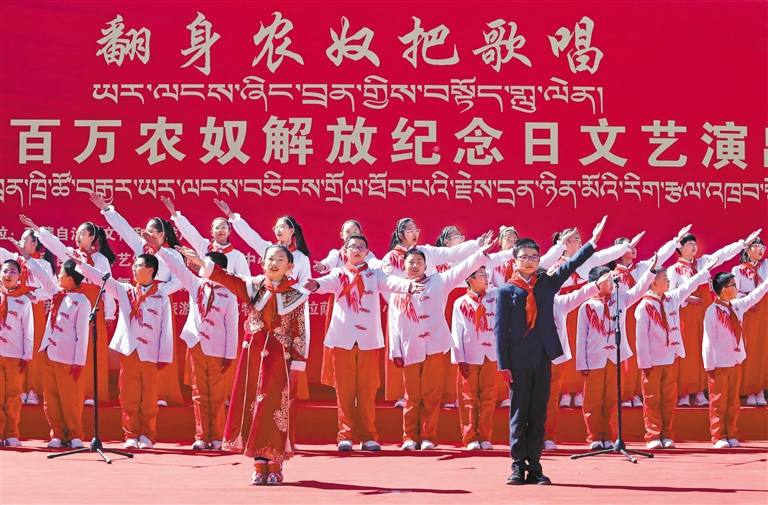 3月28日,由自治区文旅厅主办、自治区群艺馆(区非遗保护中心)承办的“翻身农奴把歌唱”西藏百万农奴解放纪念日文艺演出在拉萨市曲米路湿地公园举行。图为文艺演出现场。本报记者 白玛泽旺 摄
