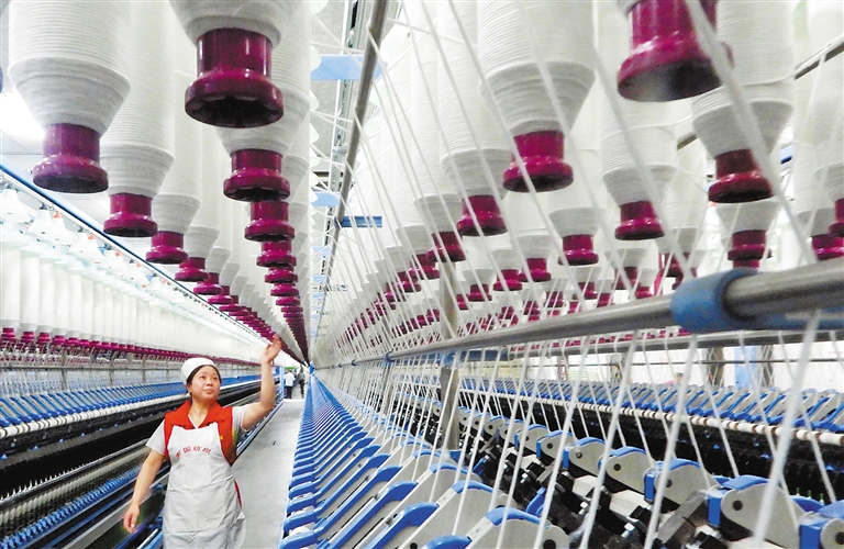 图④:3月30日,在四川省达州高新区南国纺织印染有限公司生产车间,工人在赶制出口棉布订单。新华社发