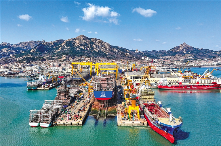图②:3月30日,在山东省荣成市石岛管理区修造船产业基地船坞内,工人在建造大型船舶(无人机照片)。新华社发(李信君 摄)