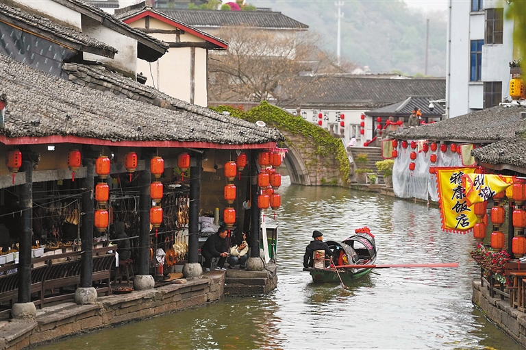 图为3月29日,一条乌篷船行驶在安昌古镇的河道上。