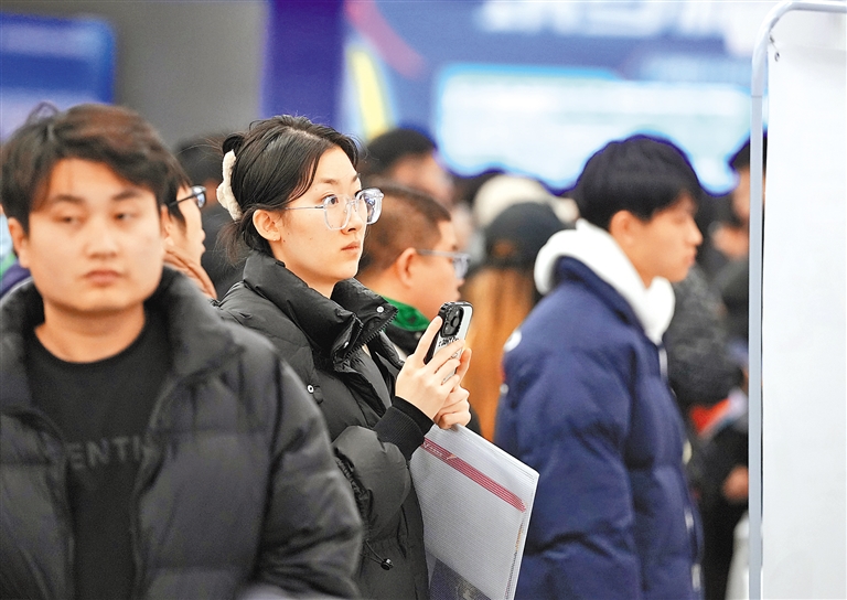 3月29日,以“筑梦新铁西,聚力促振兴”为主题的现场招聘活动在辽宁沈阳的全球工业互联网大会会议中心举行。据介绍,此次活动吸引百余家沈阳地区的知名企业和科研院所参加,东北地区100余所普通高校和职业技术院校的5000余名毕业生参与线上线下招聘活动。图为在沈阳的全球工业互联网大会会议中心,应聘者关注招聘信息。新华社记者 李钢 摄