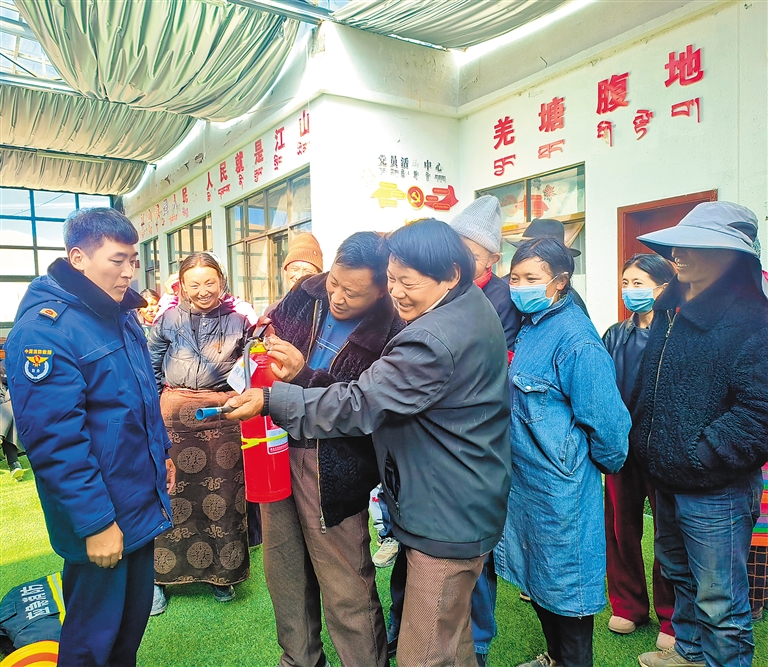 图为改则县消防救援大队工作人员为牧区群众讲解消防器材使用技巧。 图片由改则县消防救援大队提供