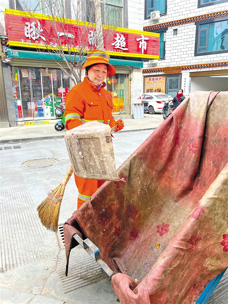 在拉萨市城关区团结新村街巷间,每天清晨天还未亮,一个敦实的身影便忙碌起来。她手持一把大扫帚,一丝不苟地清扫路面,直到天空放亮,她的工作才告一段落。