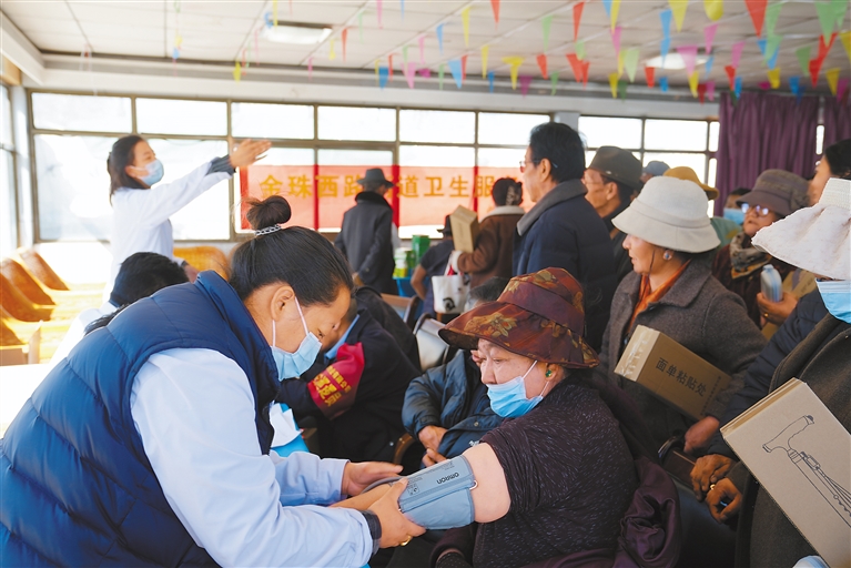 近日,拉萨市城关区卫健委组织医务人员深入金珠西路街道七一社区开展“西藏百万农奴解放纪念日”主题健康义诊活动,为社区居民送去优质的医疗服务。 图为义诊活动中,医生为社区居民测量血压。 本报记者 格桑伦珠 本报通讯员 次旺罗布 摄