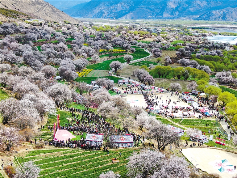 4月3日上午,林芝第二十二届桃花旅游文化节巴宜区分会场活动在布久乡朵当村桃花园举行。图为游客在朵当村桃花园赏花游玩(无人机照片)。 本报记者 刘枫 谢筱纯 摄