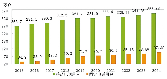 年末电话用户总数450.84万户。其中,固定电话用户97.38万户,移动电话用户353.46万户。移动电话用户本年新增10.97万户,移动电话普及率达96.84部/百人。移动互联网用户331.4万户,比上年增加13.66万户;固定互联网宽带接入用户159.19万户,增加13.67万户;固定互联网光纤宽带152.59万户,增加14.80万户。家庭宽带接入用户家庭普及率达129.10部/百户,农村地区宽带接入用户27.99万户,比上年末增加2.95万户。全年移动互联网接入流量12.17亿GB,比上年增长22.49%。全区行政村5G信号通达率达70%。