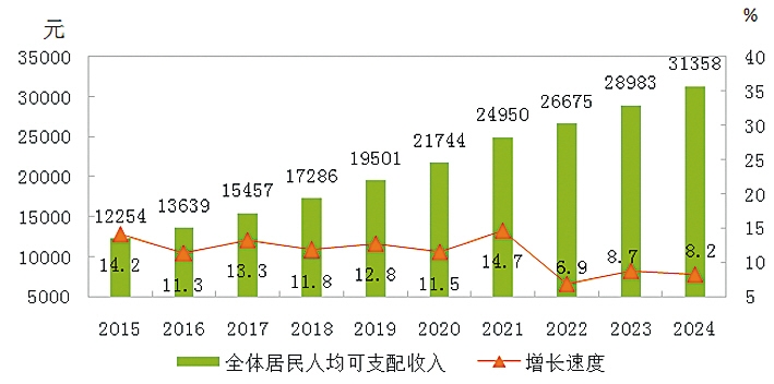 图11 2015-2024年全体居民人均可支配收入及其增长速度