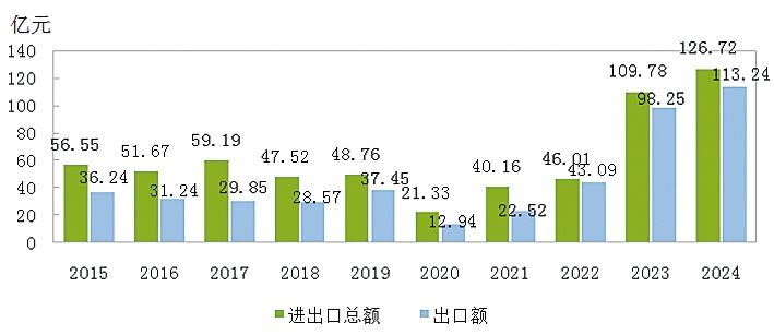 全年货物贸易进出口总额126.72亿元,比上年增长15.4%。其中,出口113.24亿元,增长15.3%;进口13.48亿元,增长16.9%。一般贸易进出口70.54亿元,下降14.3%。其中,出口58.40亿元,下降19.2%;进口12.14亿元,增长20.6%。边境小额贸易进出口35.32亿元,增长32.3%。其中,出口34.59亿元,增长33.7%;进口0.73亿元,下降11.5%。