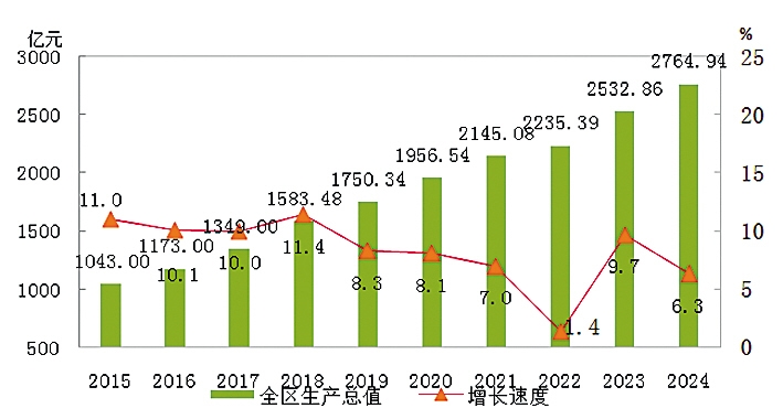 初步核算,全年地区生产总值(GDP)2764.94亿元,按可比价计算,比上年增长6.3%。其中,第一产业增加值247.52亿元,增长11.5%;第二产业增加值1016.07亿元,增长8.2%;第三产业增加值1501.35亿元,增长4.5%。人均地区生产总值75237元,增长5.4%。