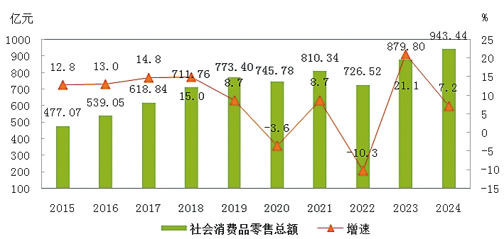 全年社会消费品零售总额943.44亿元,比上年增长7.2%。按销售单位所在地分,城镇消费品零售额766.63亿元,增长7.0%;乡村消费品零售额176.81亿元,增长8.4%。按消费形态分,商品零售849.29亿元,增长7.6%;餐饮收入94.15亿元,增长4.3%。