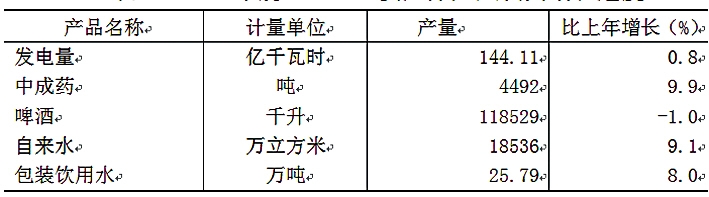 全年规模以上工业企业中成药产量4492吨,增长9.9%;自来水18536万立方米,增长9.1%;包装饮用水25.79万吨,增长8.0%;发电量144.11亿千瓦时,增长0.8%;啤酒118529千升,下降1.0%。