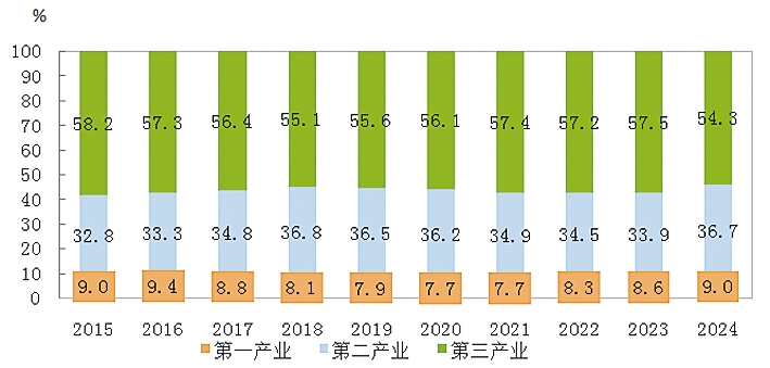 图2 2015-2024年三次产业增加值占地区生产总值比重