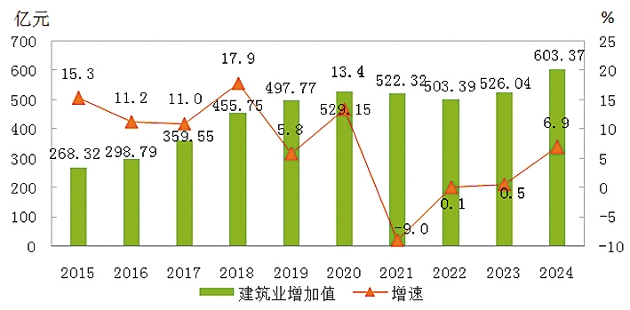 全年建筑业增加值603.37亿元,按可比价计算,比上年增长6.9%。
