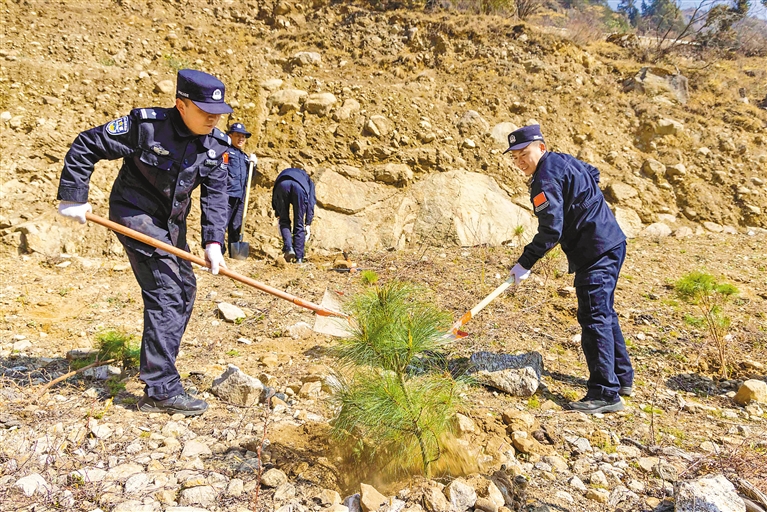 民警挥锹铲土栽种树苗。